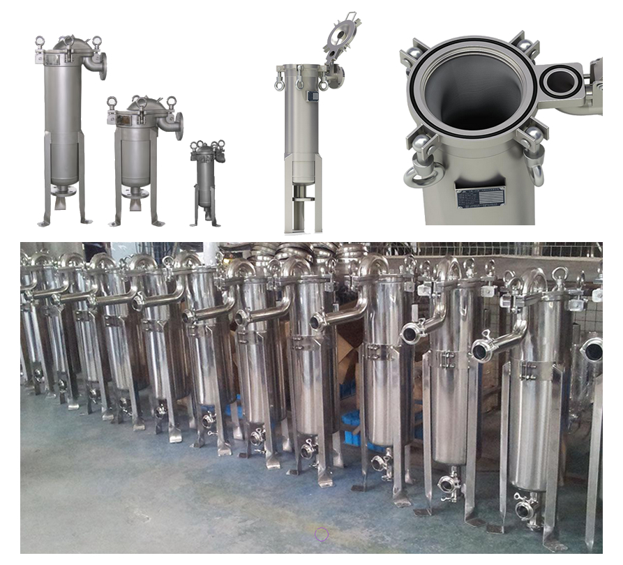 袋式過(guò)濾機(jī)是一種壓力式過(guò)濾裝置,主要由過(guò)濾筒體、多孔支撐濾籃、濾袋等主要部件組成。介質(zhì)由過(guò)濾器外殼的側(cè)入口或頂入口管流入濾袋,滲透過(guò)所需要精度等級(jí)的濾袋即能獲得合格的介質(zhì),雜質(zhì)顆粒被濾袋攔截,便能達(dá)到介質(zhì)被過(guò)濾的效果。